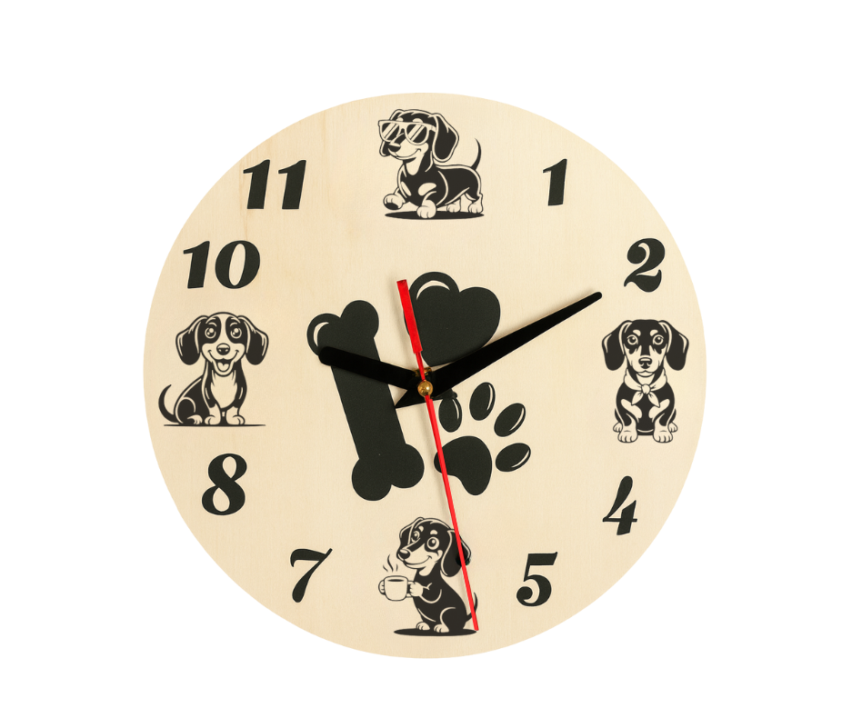 Roztomilé dřevěné hodiny, které potěší každého milovníka pejsků! Tento originální kousek s motivy jezevčíků krásně ozdobí dětský pokoj, obývák i vstupní chodbu.